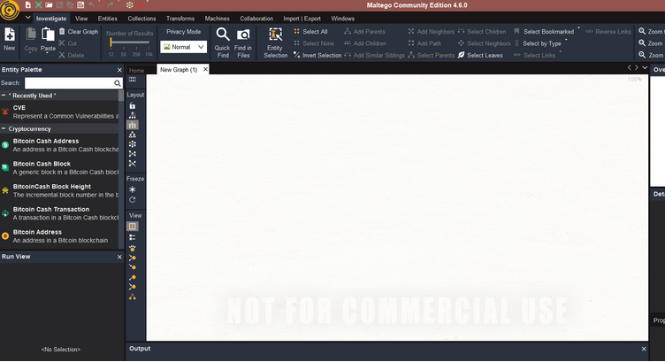 Después de esto, vendrá el proceso de elección del tipo de licencia que queramos usar, en nuestro caso la Community Edition. Para ello nos pedirá logearnos (o registrarnos en caso de que no tengamos una cuenta hecha) y una vez logueados ya entraremos en el menú de Maltego, el cuál se ve así:
