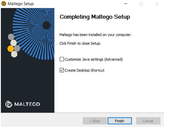 Aquí, seleccionamos la opción que está marcada en caso de que no tengamos Javax64, si ya la tenemos instalada descargamos solo el .exe de Maltego. Seguimos el proceso común de instalación hasta que finalmente nos salga esta pantalla.